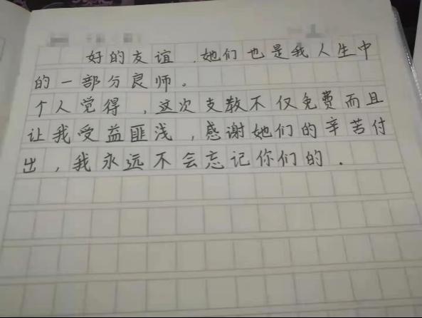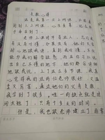 “作为一名小学生,从最初的有些羞涩到之后的勇于回答问题,我觉得自己学会了很多。非常感谢苗苗老师付出的心血,相信我的语文水平也能够得到一些提升……这十几天的宝贵经历我会一直记在心中,我也会更加努力学习,不辜负老师的期待。”(姬云浩,小学三年级学生)