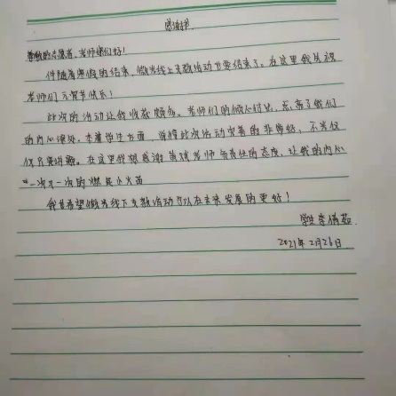元宵节过后,学生们开学的步伐也越来越近,短暂的相处也迎来了告别。“我班谭惜允妈妈特别过来跟我说到你们,对学生指导非常细心,以后有类似公益活动,仍请推荐给我们。”一位帮忙动员招生的初中班主任发来的反馈在志愿者群里引起了热烈的讨论。但让这群年轻人感到兴奋的还不止于此,学生们的一封封手写感谢信更是让他们意想不到。